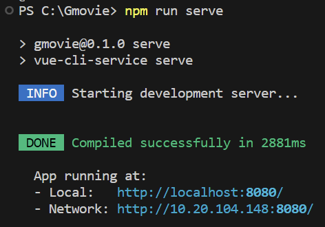6. npm run serve 명령어를 입력해 npm 서버를 실행하여 제대로 실행되는지 확인합니다.