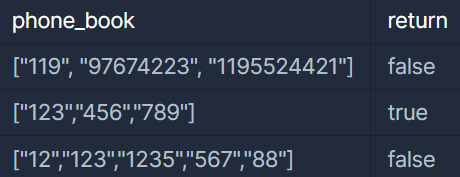 전화번호부에 적힌 전화번호를 담은 배열 phone_book 이 solution 함수의 매개변수로 주어질 때, 어떤 번호가 다른 번호의 접두어인 경우가 있으면 false를 그렇지 않으면 true를 return 하도록 solution 함수를 작성해주세요.