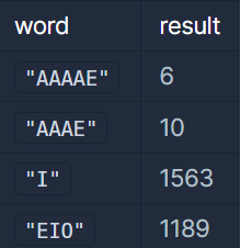 - word는 알파벳 대문자 'A', 'E', 'I', 'O', 'U'로만 이루어져 있습니다.