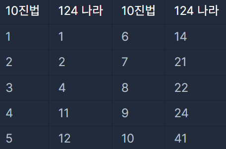 1. 10진법 숫자 n을 124 나라의 숫자로 변환