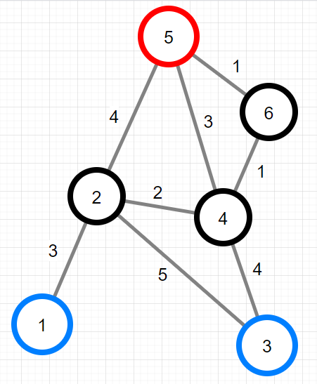 - 위 그림에서 원에 적힌 숫자는 지점의 번호를 나타내며, 1, 3번 지점에 출입구, 5번 지점에 산봉우리가 있습니다. 각 선분은 등산로를 나타내며, 각 선분에 적힌 수는 이동 시간을 나타냅니다. 예를 들어 1번 지점에서 2번 지점으로 이동할 때는 3시간이 소요됩니다.