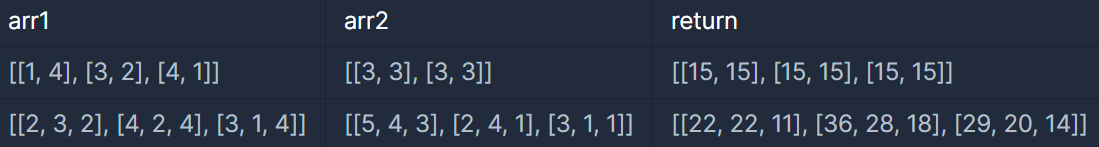 - 행렬 arr1, arr2의 행과 열의 길이는 2 이상 100 이하입니다.