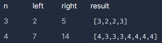 정수 n, left, right가 매개변수로 주어집니다. 주어진 과정대로 만들어진 1차원 배열을 return 하도록 solution 함수를 완성해주세요.