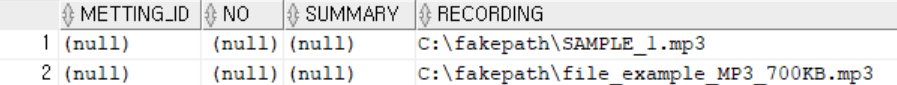 "INSERT INTO SUMMARY (RECORDING) VALUES (?)",