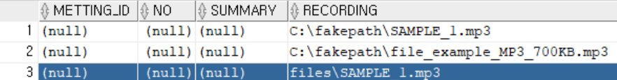 그리고 원래는 회의룸ID와 사용자 고유 번호인 no을 외래키로 참조하여 NOT NULL 제약조건을 걸어뒀었으나.. 아직 다른 팀원으로부터 코드를 받지 못해서 해당 제약 조건을 NULL로 변경하고 DB에 경로가 저장되는지만 테스트해봤다.
