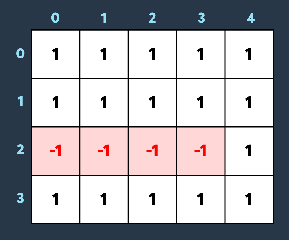 마지막으로 적이 맵의 (0,1)부터 (3,3)까지 공격하여 1만큼 건물의 내구도를 낮추면 아래와 같이 8개의 건물이 더 파괴되어 총 10개의 건물이 파괴된 상태가 됩니다. (내구도가 0 이하가 된 이미 파괴된 건물도, 공격을 받으면 계속해서 내구도가 하락하는 것에 유의해주세요.)