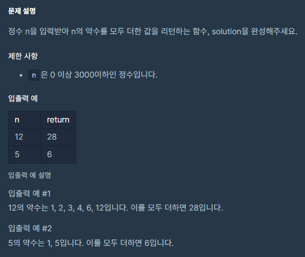 정수 n의 약수를 구하는 방법은 1부터 n까지 어떤 값으로 나눴을 때 나머지가 0이 되면 그 수는 정수 n의 약수임을 뜻한다. 예를들면 정수 10이 있다고 가정하자. 10을 1, 2, 5, 10으로 나누면 나머지가 0이고 1, 2, 5, 10은 곧 10의 약수라는 의미가 된다.