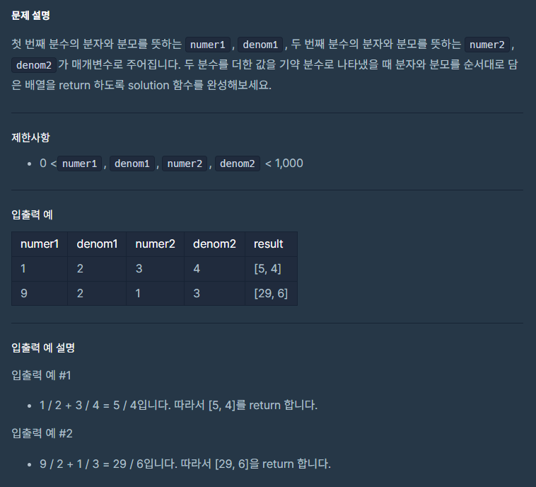 분수의 덧셈 과정을 코드로 변환하는 것과 같다. 조건이 기약분수일 경우 최대공약수를 구하는 것을 기억할 것. 분모와 분자 중 어떤 게 더 큰 값인지 알 수 없으므로 && 연산자를 사용하여 max 값을 찾는다. max를 찾으면 최대공약수를 업데이트 하고 약분을 한다. 그 값을 배열에 넣으면 끝. 원래는 맨 위에 있던 int[] answer = { }; 를 아래쪽으로 옮겼다.