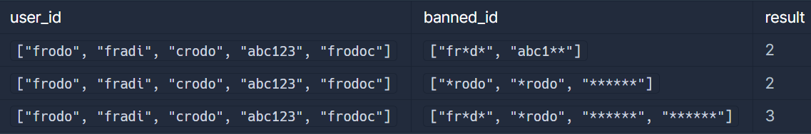 - banned_id 배열의 크기는 1 이상 user_id 배열의 크기 이하입니다.