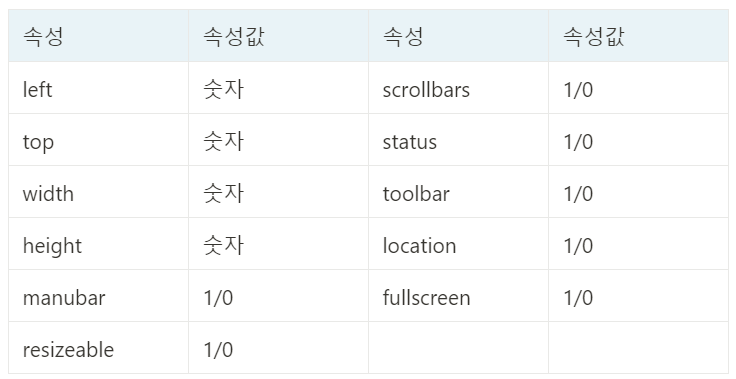 - window.open(”팝업창 주소”, “이름”, “속성”)