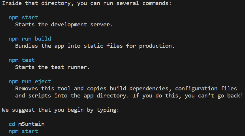 npm 업데이트 완료 후 아래 명령어를 입력하면 react 개발환경에 필요한 파일들이 자동으로 생성됩니다.