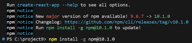 이런, npm 버전 업데이트를 하라네요. 친절하게 명령어까지 알려줍니다.