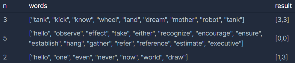- words는 끝말잇기에 사용한 단어들이 순서대로 들어있는 배열이며, 길이는 n 이상 100 이하입니다.